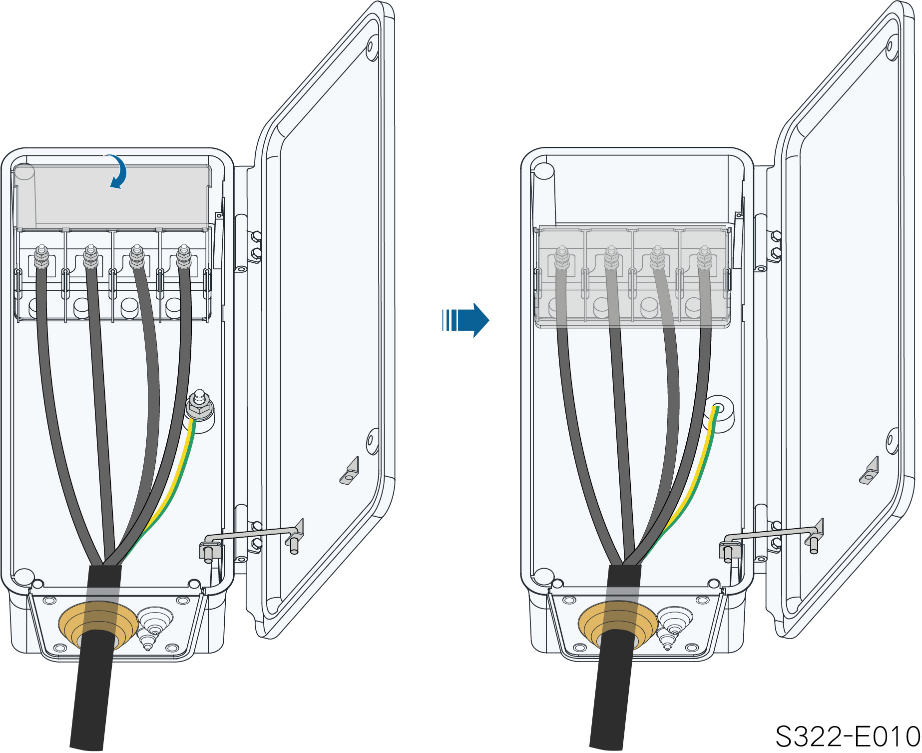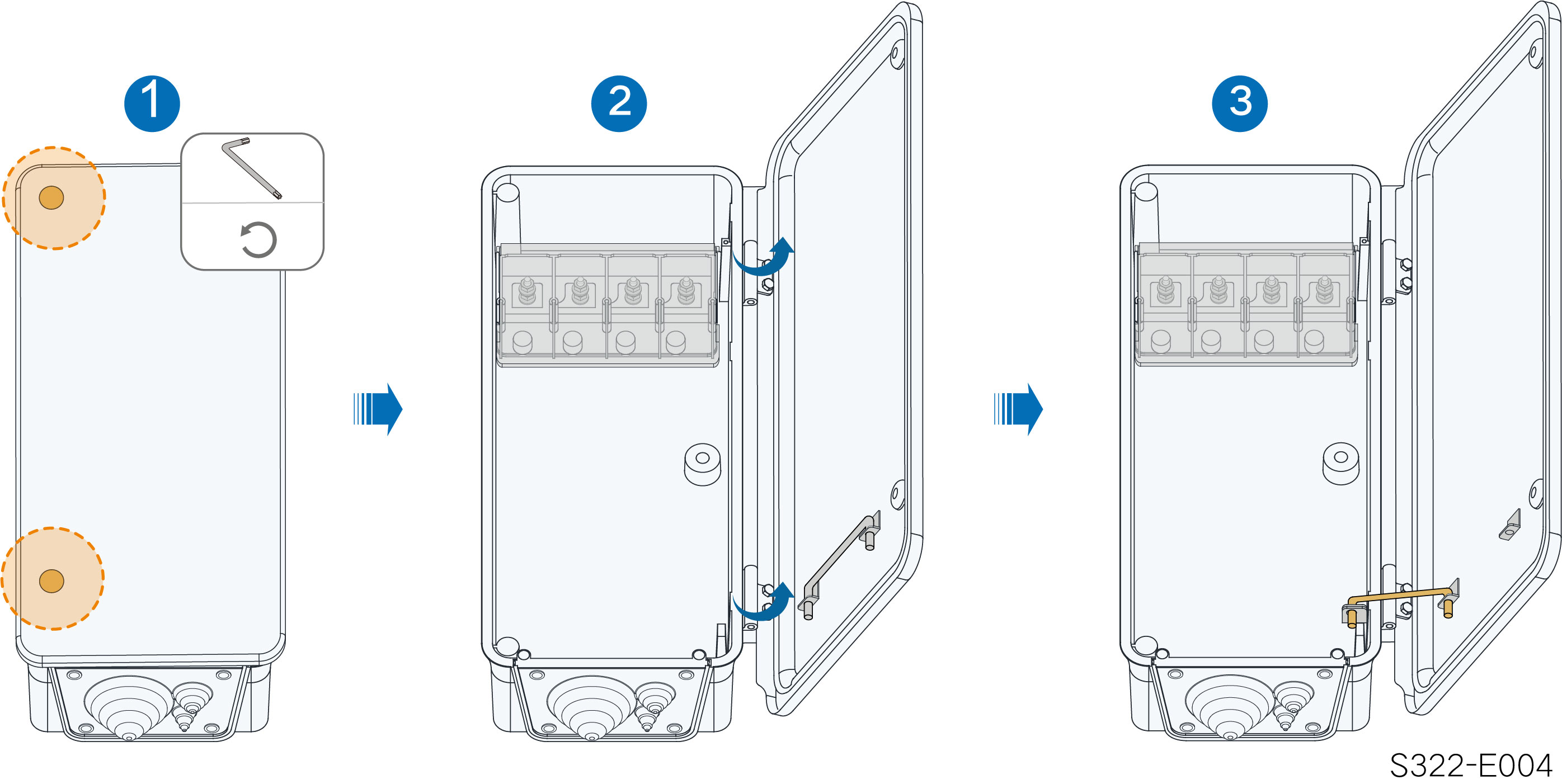 - 用提供的内六角扳手松开接线盒前盖上的两个螺丝。打开接线盒。在接线过程中,连接在盖子上的限位杆使接线盒一直处于打开状态。