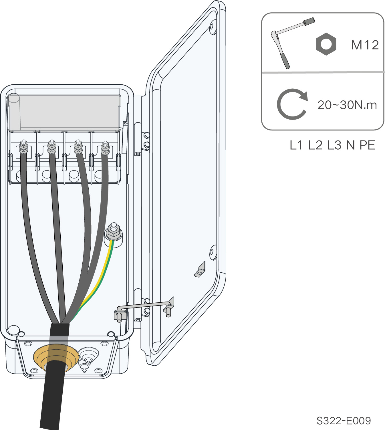 Notice: “PE”线缆和“N”线缆的位置。如果相线接到“PE”或“N”线缆的端子上,可能导致逆变器永久性损坏。