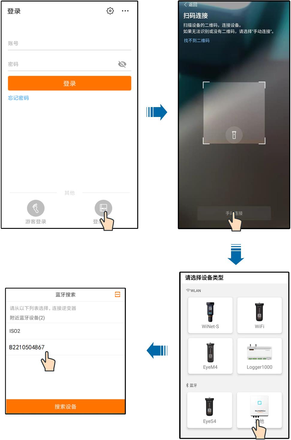 - 扫描逆变器侧面的二维码进行蓝牙连接。也可点击页面下方的“手动连接”选择“其他”,蓝牙搜索界面自动弹出,根据机身侧面铭牌上的序列号选择需要连接的逆变器,