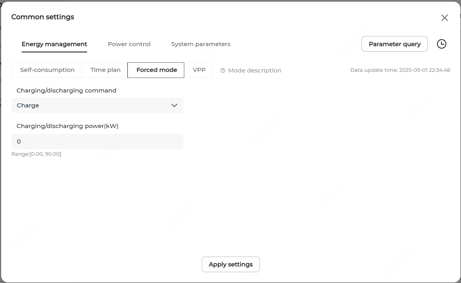 - If Charge or Discharge is selected, set the target charging or discharging power in Charging/Discharging Power.