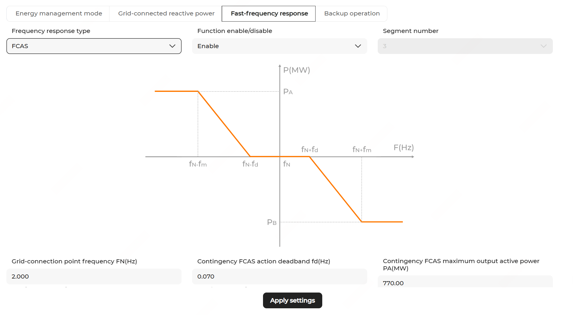 Parameter Description fN Rated frequency of grid-connection point fd Contingency FCAS action deadband PA Contingency FCAS maximum output active power PB Contingency FCAS maximum absorption active power fm Contingency FCAS frequency deviation threshold for full-scale response - Click Apply settings. In the pop-up window, enter the Task name, and click Confirm.