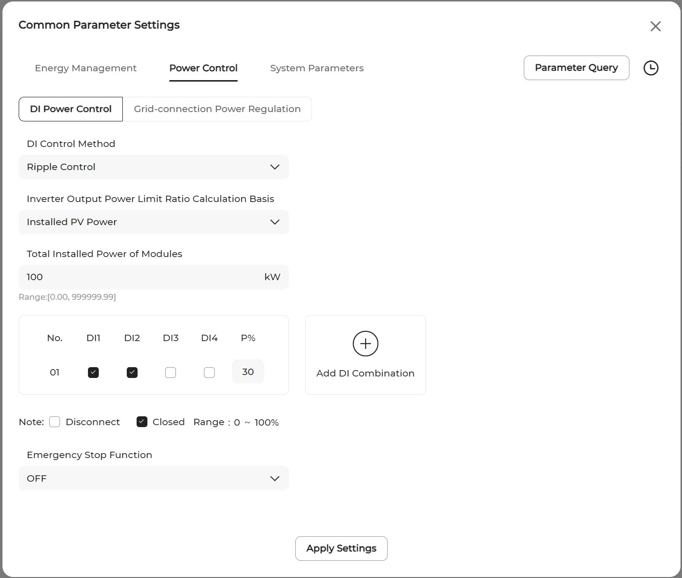 If the Ripple Control mode is selected, the grid operator will convert the dispatch signals into the dry contact signals for transmission. A total of 16 DI combinations are available, each with a specific power ratio. Please set the DI combination for the system so that it can receive and respond to grid signals properly.