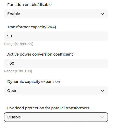 Overload protection for parallel transformers When multiple overload monitoring meters are connected to the system and overload protection is required for multiple parallel transformers, the Overload protection for parallel transformers can be enabled, and the following parameters can be configured: - Transformer capacity (kVA): Set the capacity value of the transformer connected to the current overload monitoring meter.