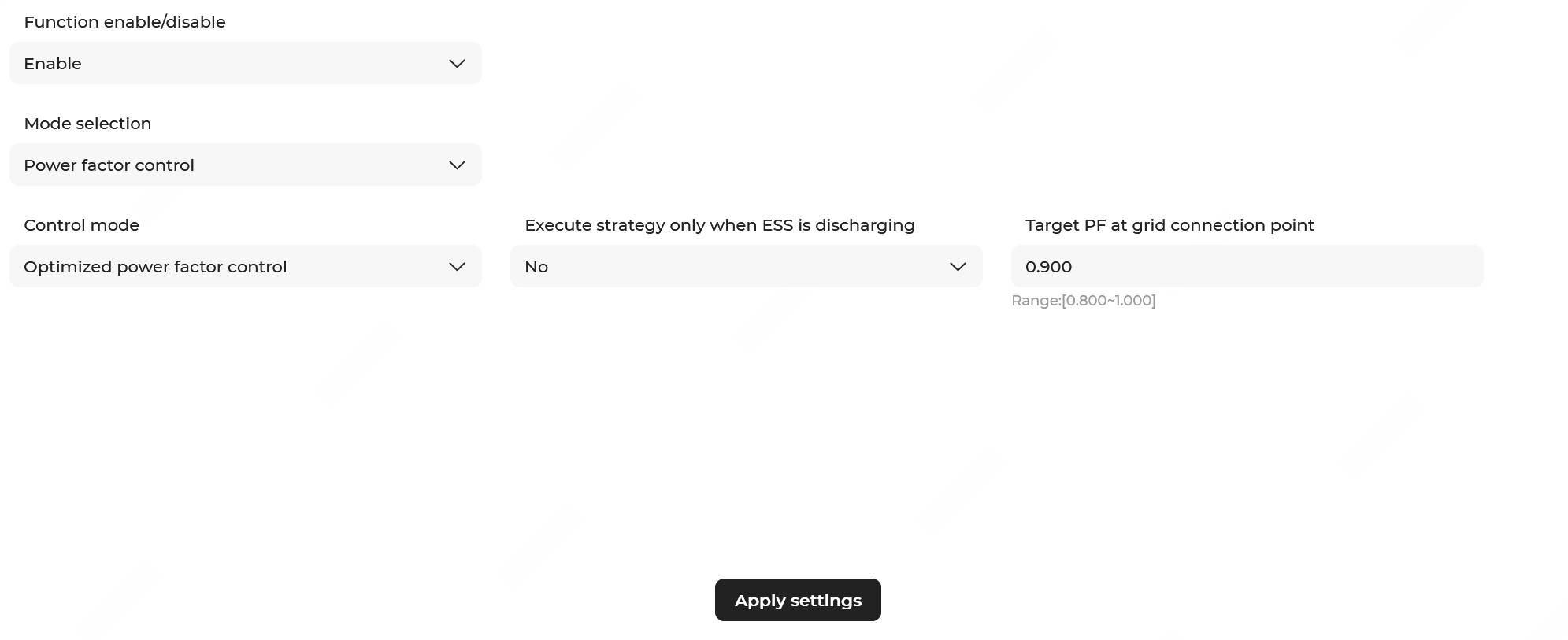 Power factor target value Range: 0.800–1.000; 0.900 by default. When the power factor falls below the set value, the system will automatically calculate the reactive power target value based on this target value and the active power at the grid connection point, and coordinate with the PV-ESS system for reactive power regulation.