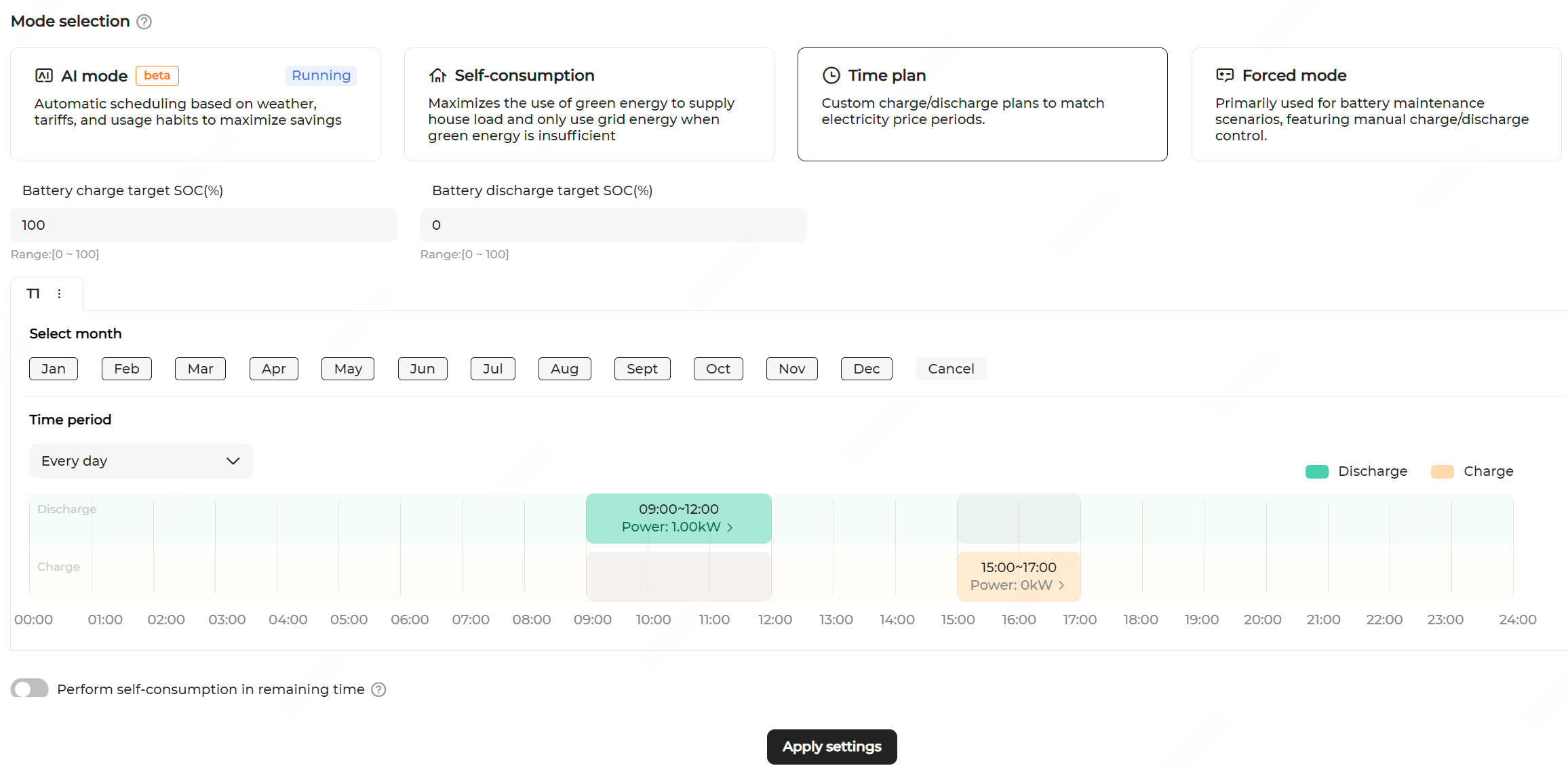 - Weekdays & Weekends: Set different charging/discharging plans for weekdays and weekends.