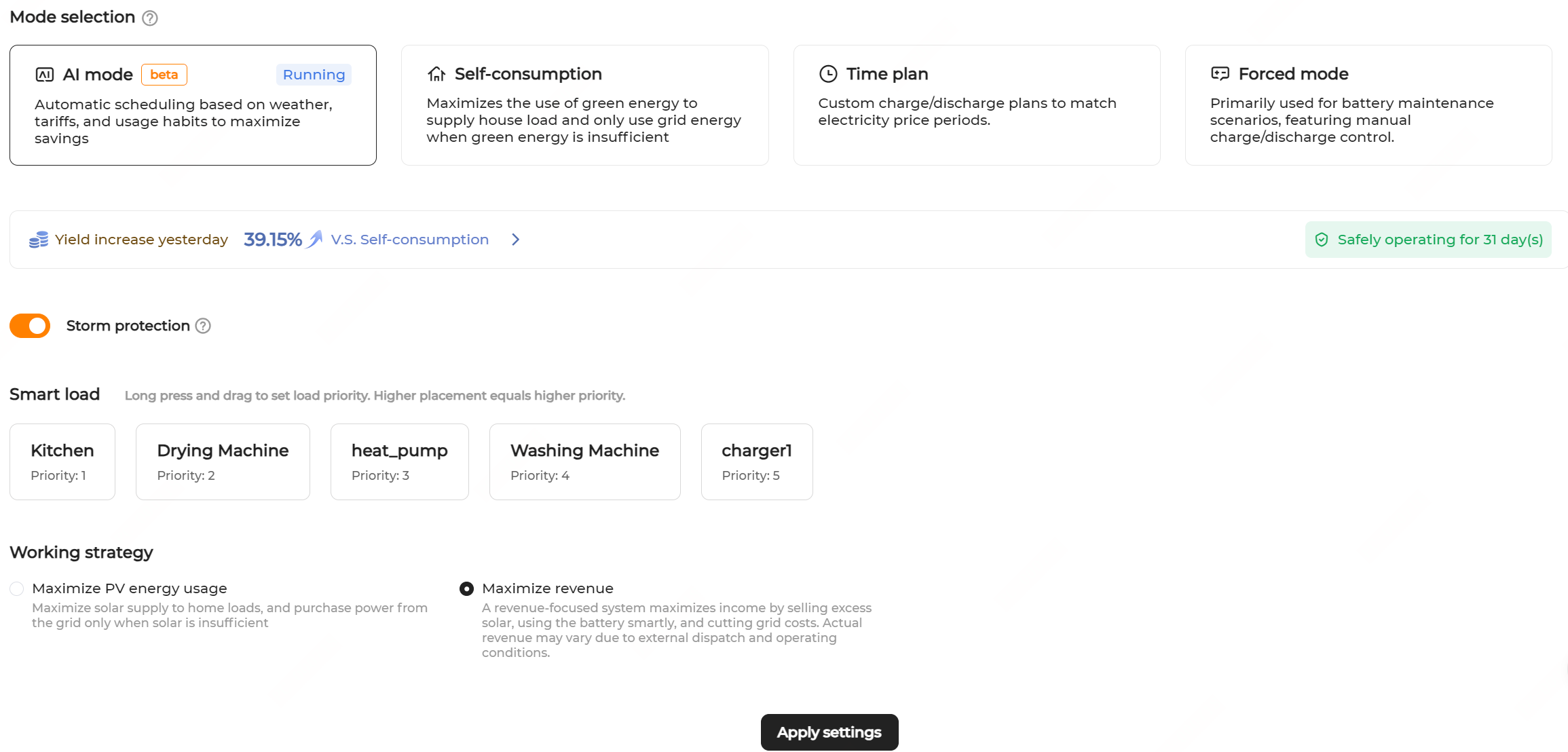 - Set Working strategy to Maximize revenue or Maximize PV energy usage.