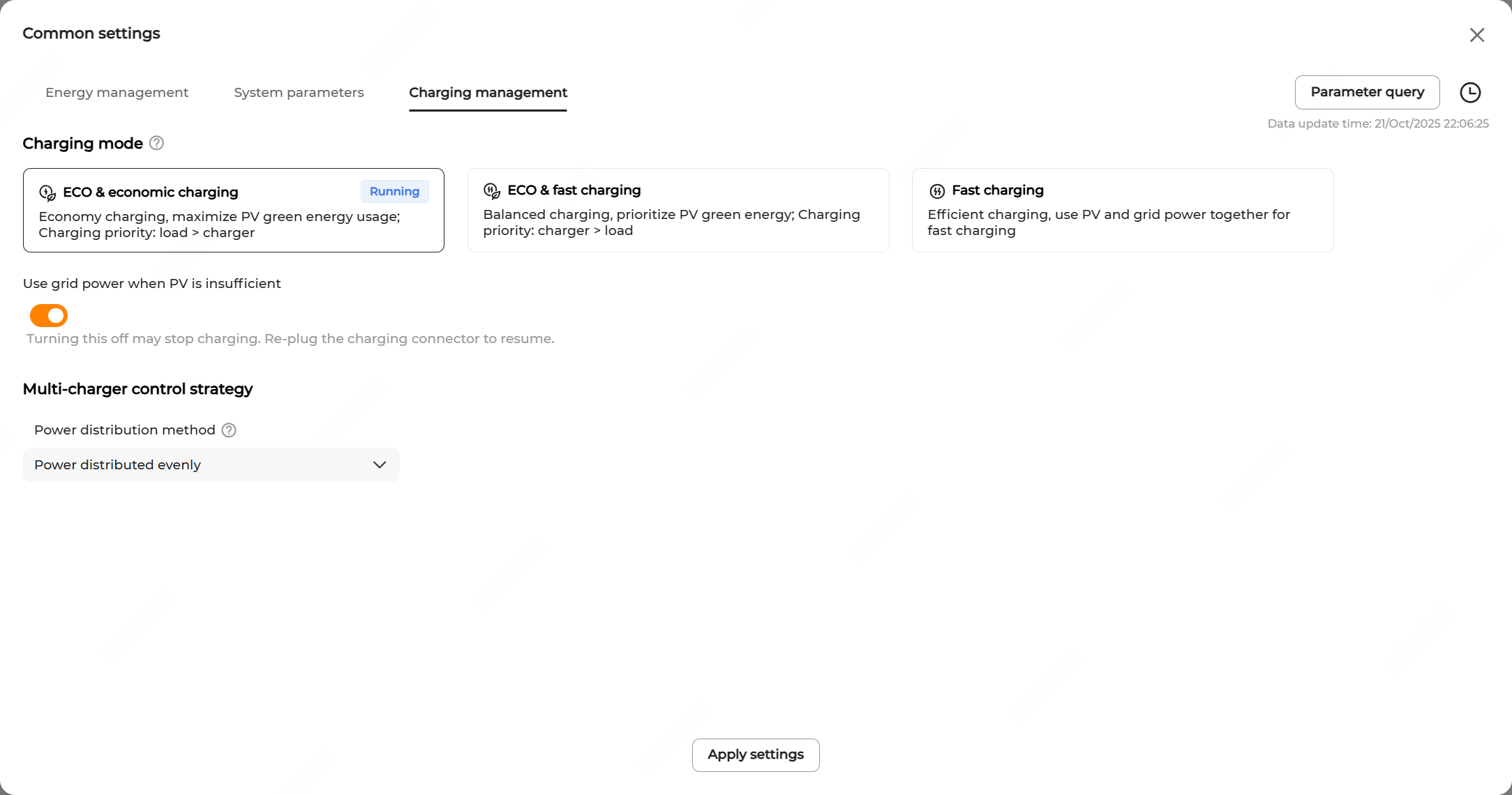 Table1 Parameter Description Parameter Description Use grid power when PV is insufficient It is turned on by default. Turning the option off may interrupt the charging process. To resume, re-plug the charging connector. Use battery when PV is insufficient It is turned on by default. Power distribution method Decide how you want to distribute power when working with the multi-charger control strategy.