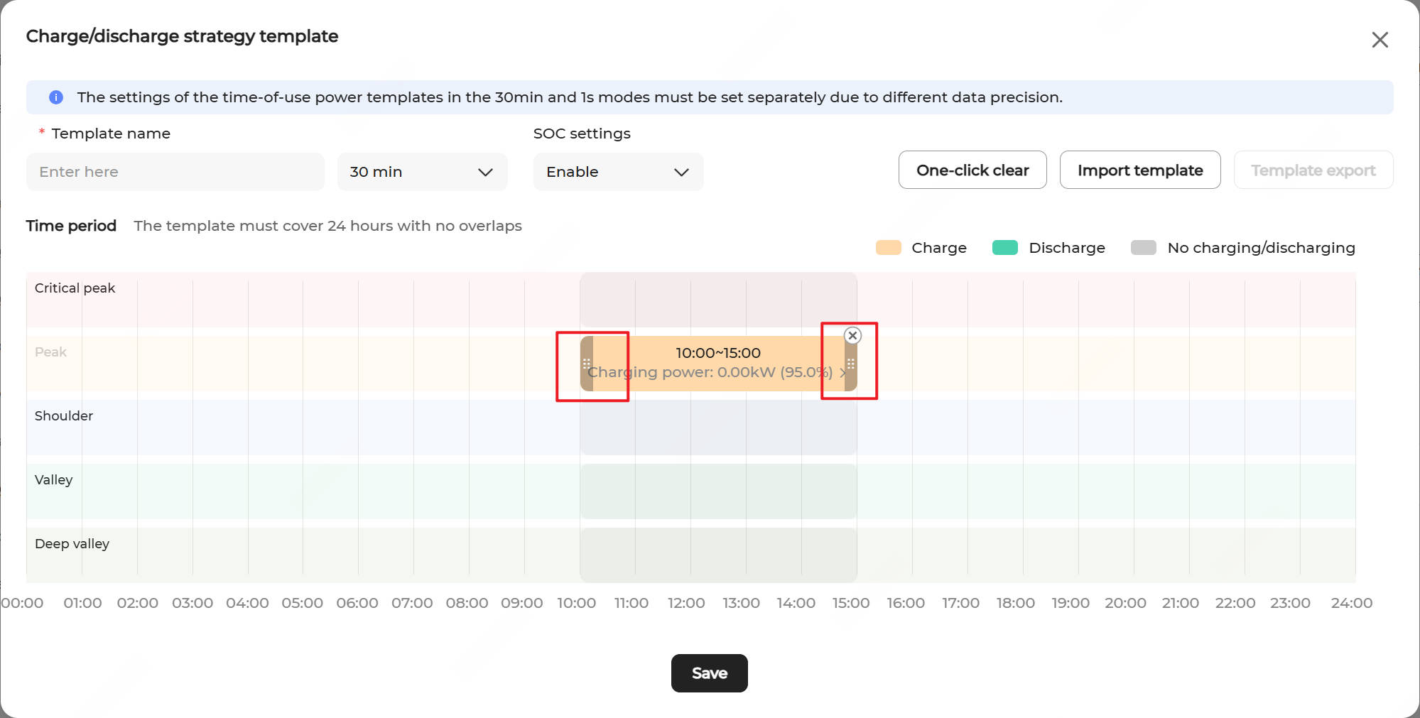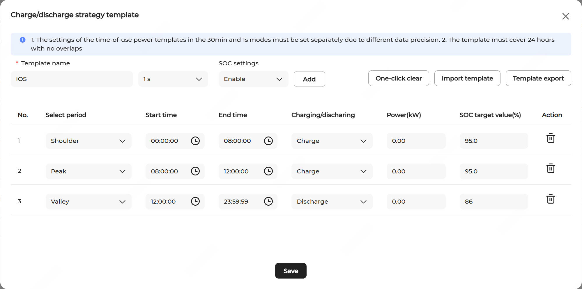 1-Second Precision Configuration:Note: The following steps demonstrate how to manually configure the charging and discharging schedule for a day. Alternatively, an existing template can be imported using the Import template button.