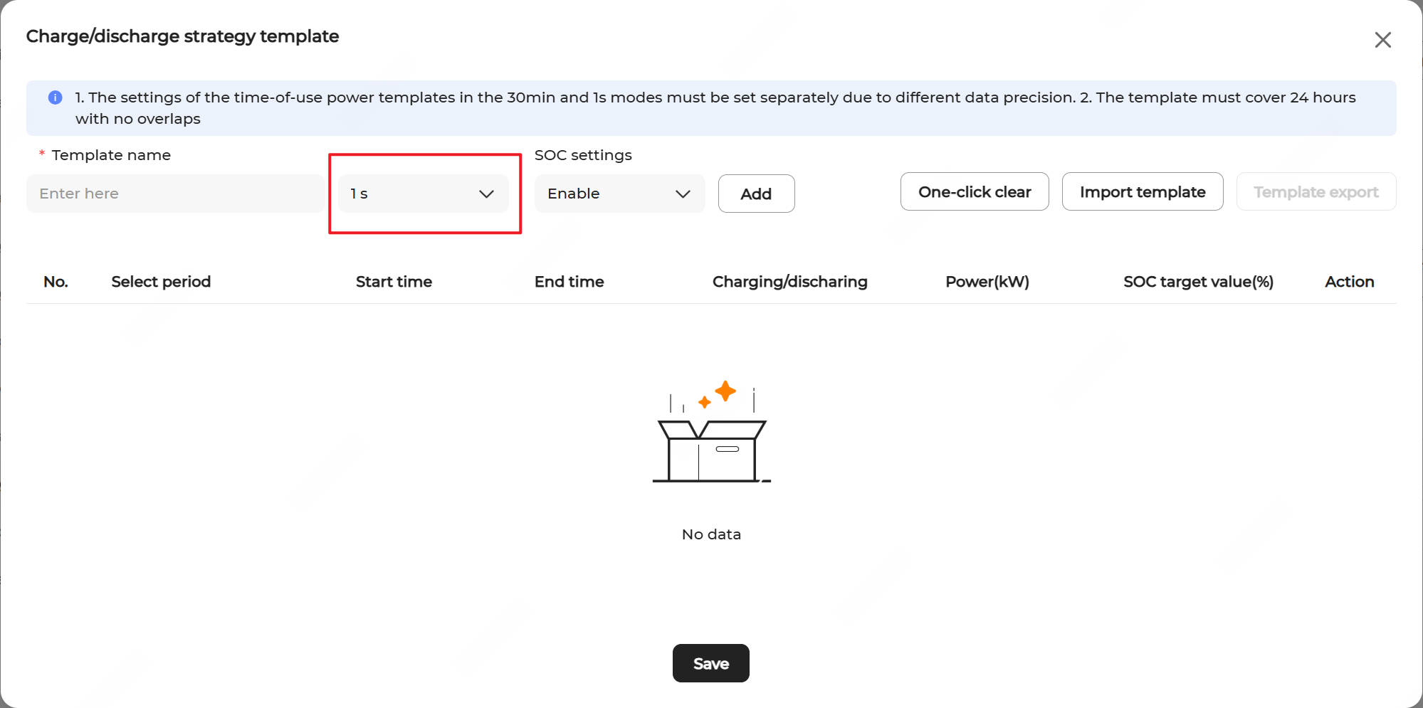 When you enable time-of-use power for the first time, a time-of-use power template must be created to define the charging and discharging schedule for different time periods. The system supports two time granularities: 30-minute interval, and 1-second interval. The following sections provide detailed setup instructions for each.