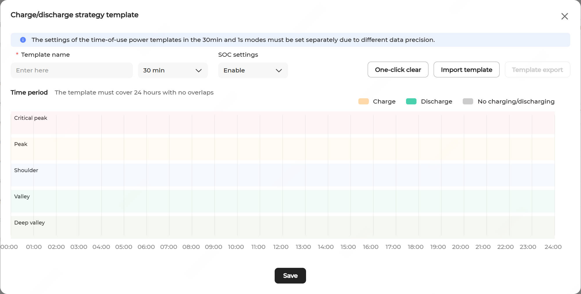 30-Minute Interval Configuration:Note: The following steps demonstrate how to manually configure the charging and discharging schedule for a day. Alternatively, an existing template can be imported using the Import template button.