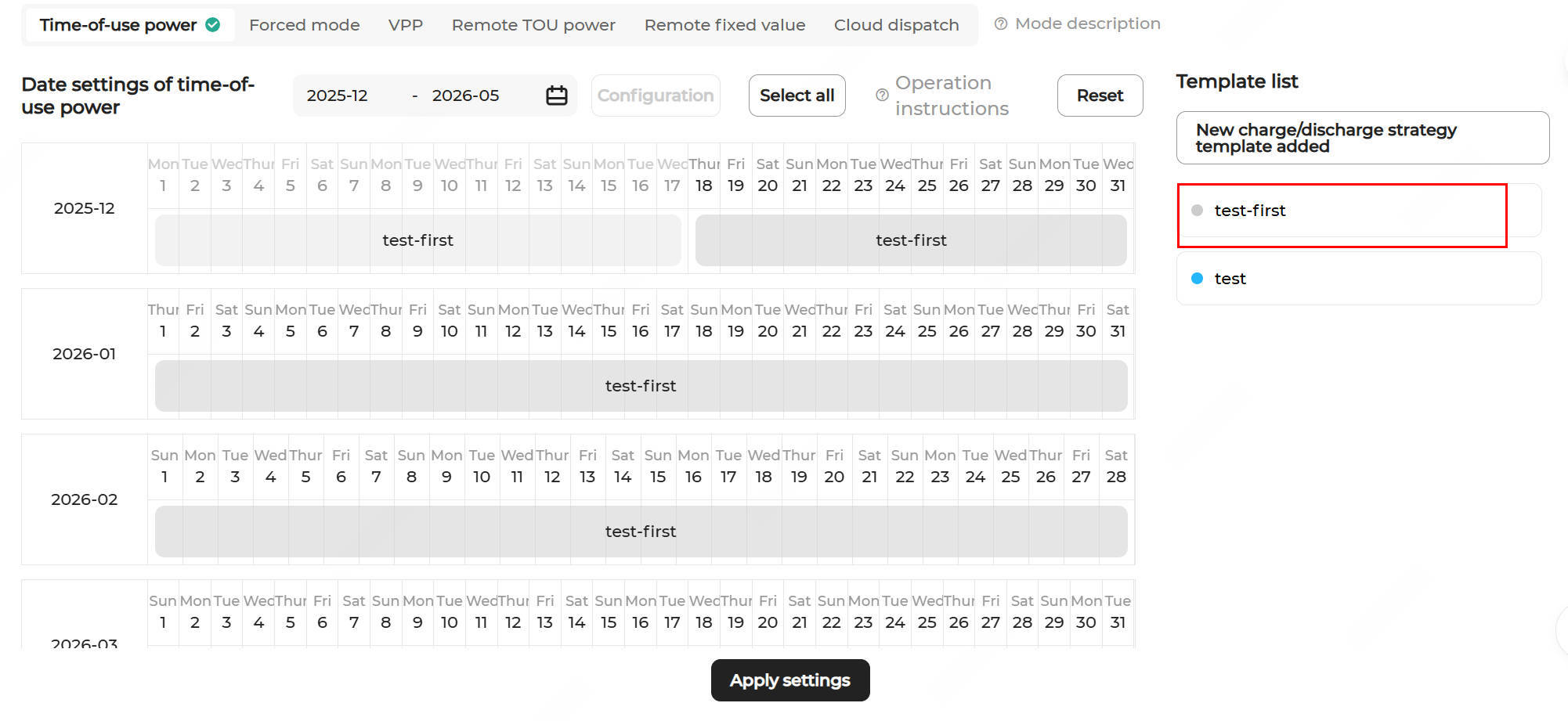 - The created template will appear in the Template list on the right panel.Note: Up to 10 charge/discharge strategy templates are supported.