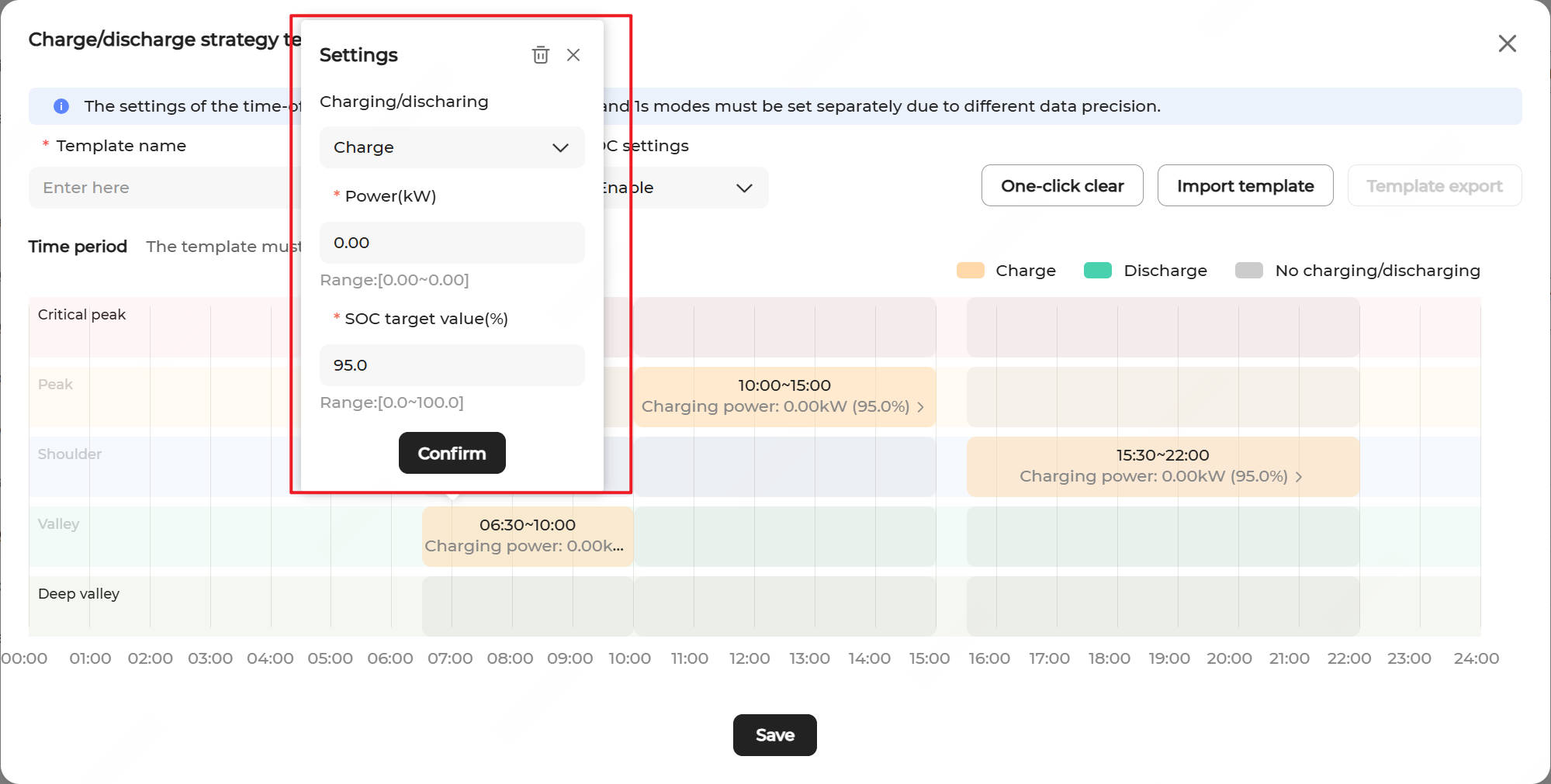 - Click a time block to configure charging and discharging parameters. Click Confirm to apply the settings.