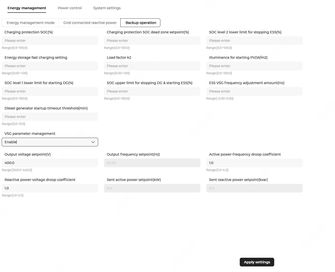 Charging protection SOC deadband (%) It defines the range within which the target charging protection SOC value can fluctuate. Default value: 2.0. Range: 0.0–100.0. SOC for stopping DG & starting ESS (%)(1) When the ESS SOC ≥ the threshold, a shutdown command is issued to the diesel generator.