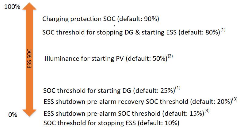 SOC for starting DG (%)(1) When the ESS SOC ≤ the threshold, a startup command is issued to the diesel generator.