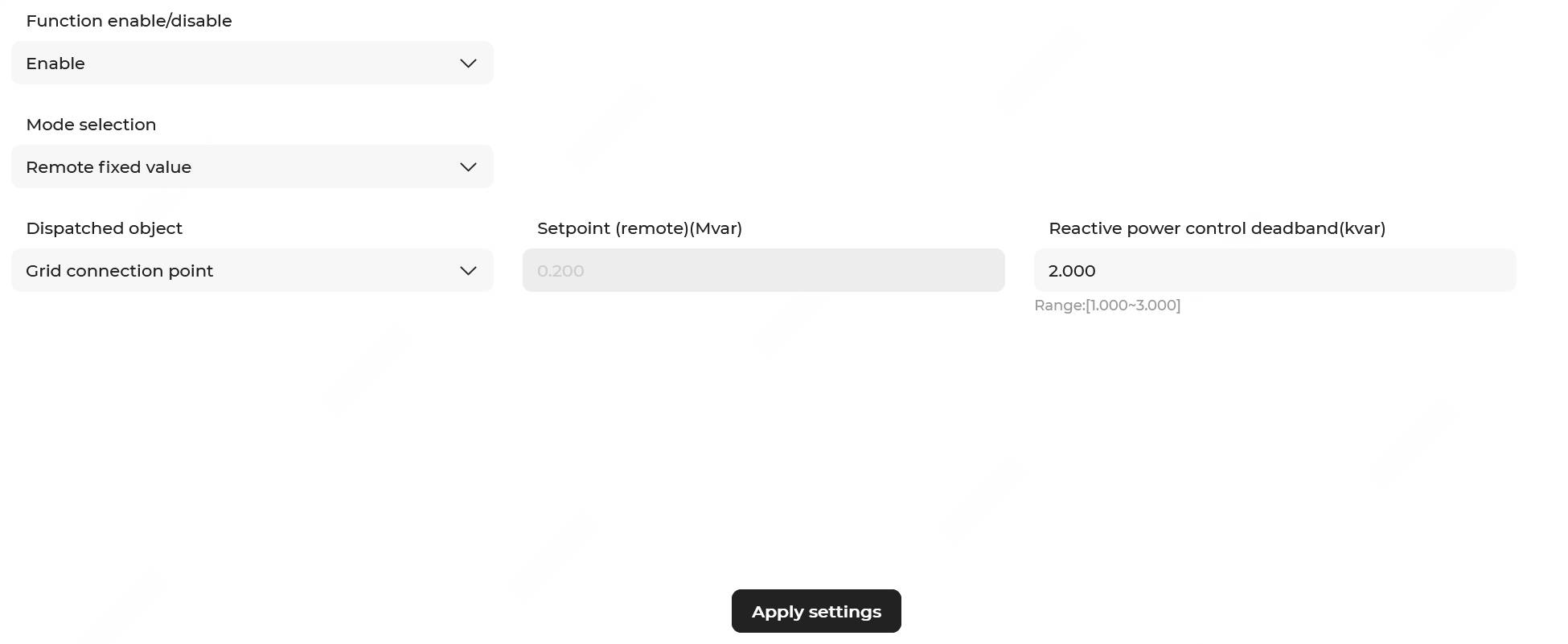 For example, if the target reactive power at the grid connection point is set to 10 kvar, and the deadband is set to 5 kvar, then the actual reactive power may fluctuate between 5 kvar and 15 kvar during operation, which is within the acceptable range.