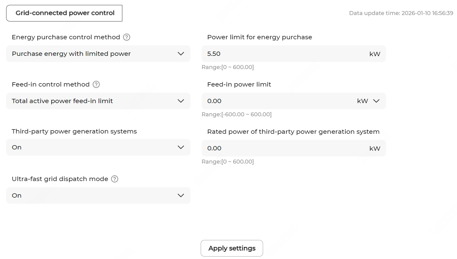 When Purchase energy with limited power is selected, input a value in Power limit for energy purchase, which is generally based on the breaker capacity on the grid connection point. An exceedingly high value will cause overcurrent tripping, while an exceedingly low value will impact the startup of controllable loads, including the chargers. |