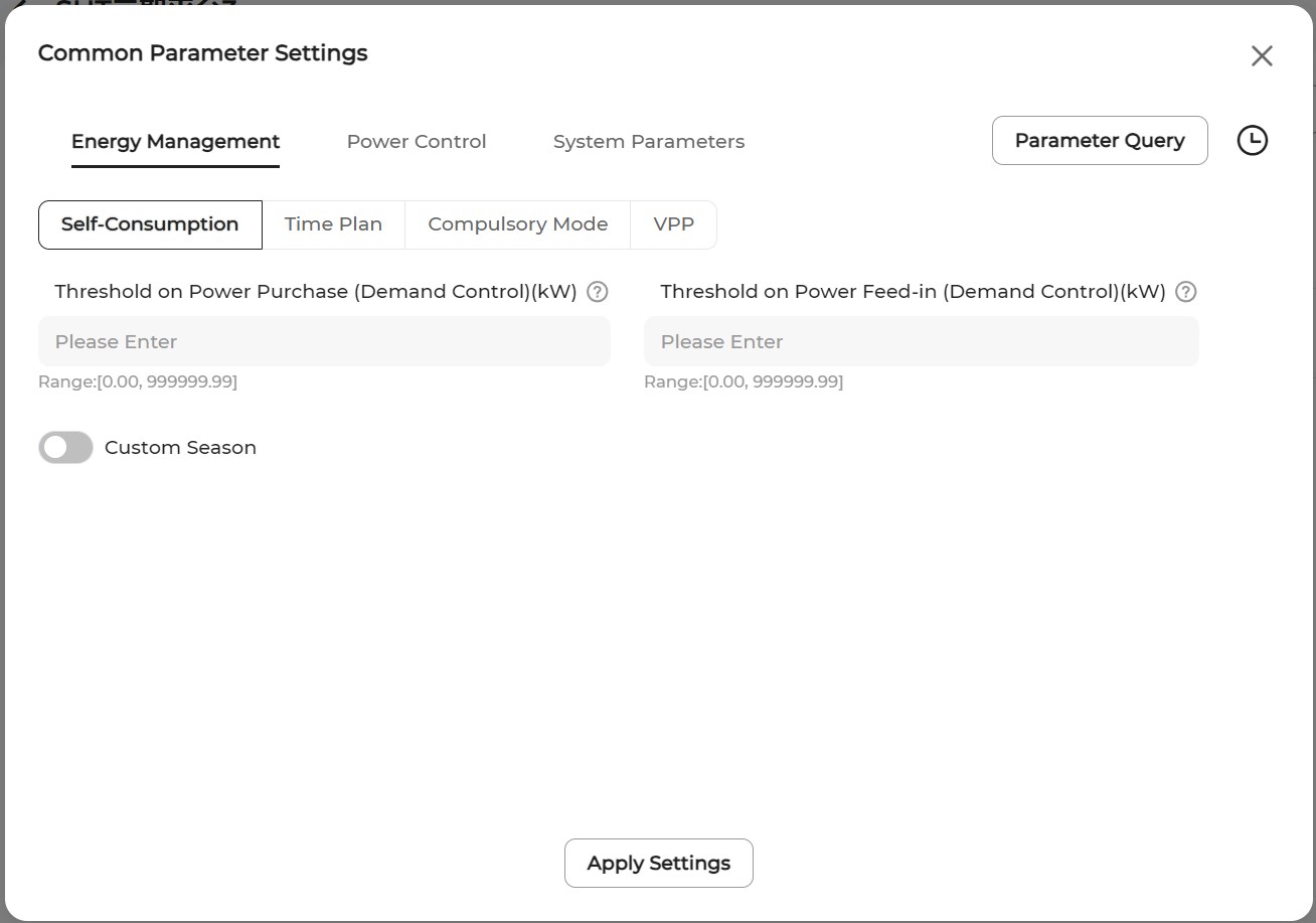 - Set the Threshold on Power Purchase (Demand Control) and Threshold on Power Feed-in (Demand Control).
