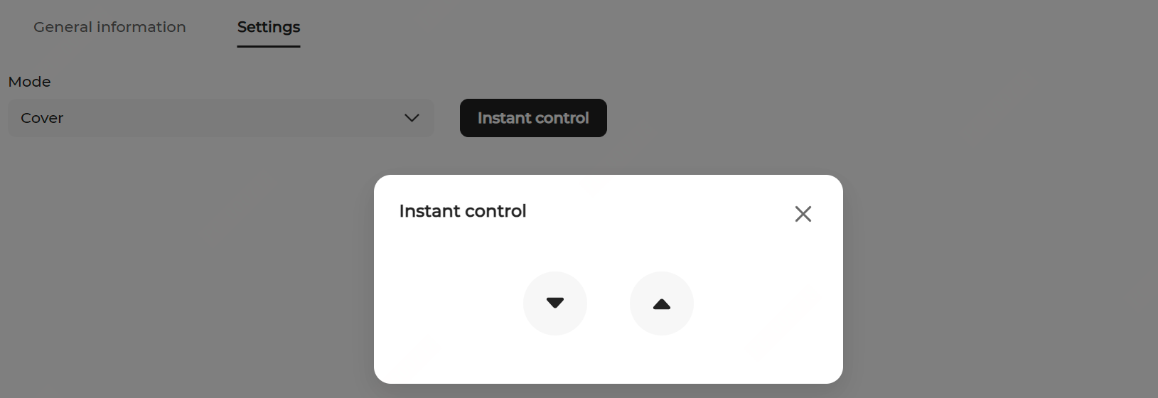 - Cover mode is used to control the roller shutter doors. Click the Instant control button, and in the pop-up, click