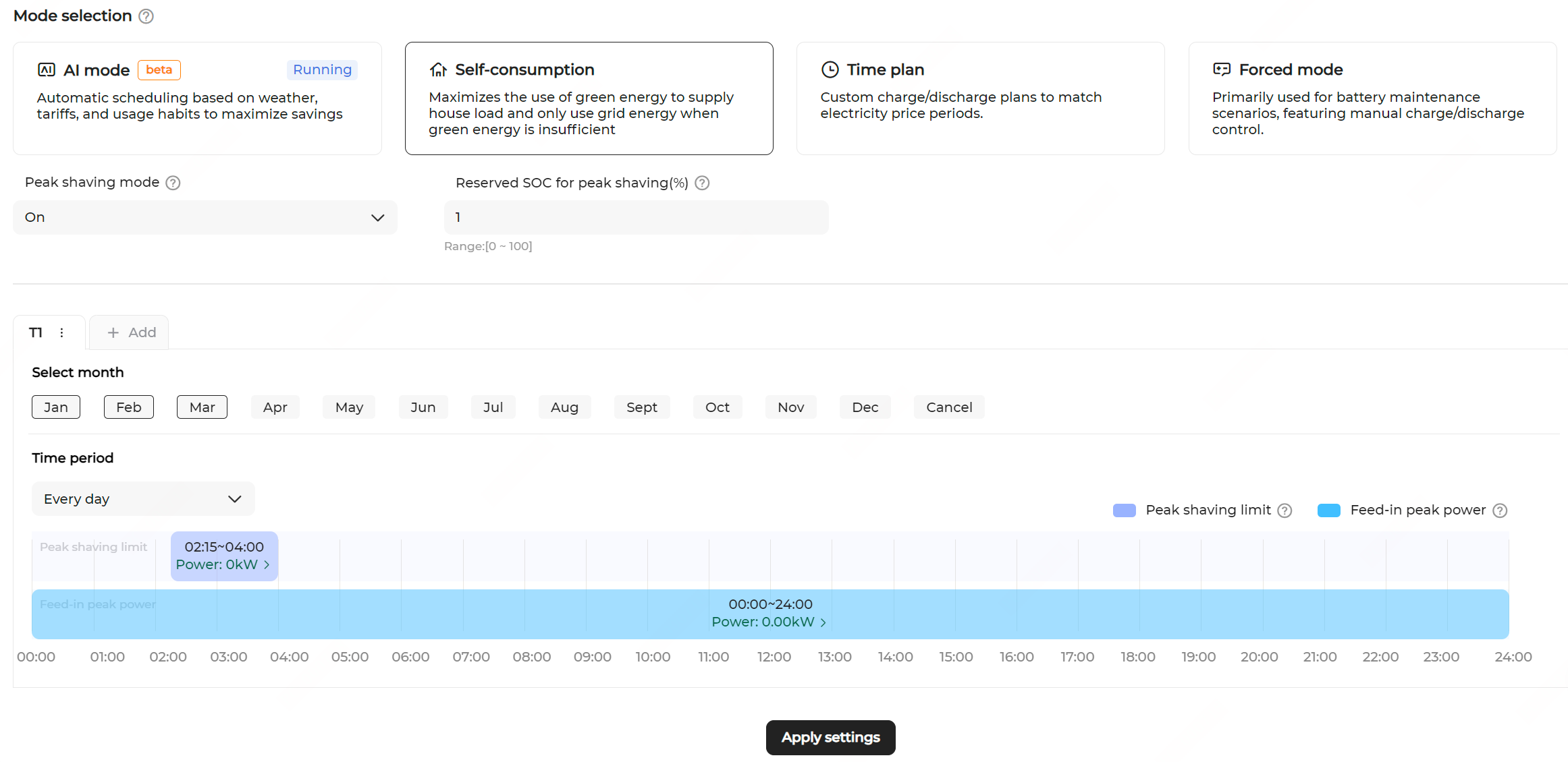 - Configure the time periods for Feed-in peak power and Peak shaving limit. See Custom Month Span for details.