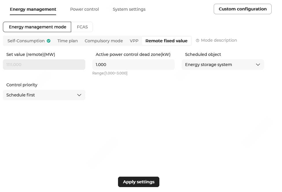 Parameter Description Set value (remote) (MW) Shows the remotely set active power when the scheduling mode is set to Third party scheduling. Active power control dead zone (kW) Set this parameter based on the actual power of the plant. It is recommended to set this parameter to 1% of the rated power.
